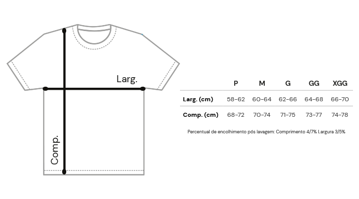 Cores do produto: Como cada tela de computador ou celular tem seu próprio jeito de mostrar cores, então a cor da sua camiseta e da estampa pode ser um pouco diferente do que você viu online.